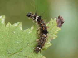 Die erwachsene Raupe des Schlehen-Bürstenspinners zeigt besonders schön die für alle "Bürstenspinner"-Arten typischen bürstenartigen Haarschöpfe auf dem Rücken und die pinselartigen schwarzen Fortsätze.