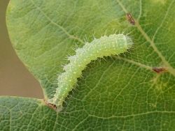 Die Eiablage erfolgt bald nach der Überwinterung, deshalb sind die Raupen schon ab Mai bis in den Juni und die der zweiten Raupen-Generation im August/ September zwischen zusammengesponnenen Blättern von Eichen (Quercus spec.).