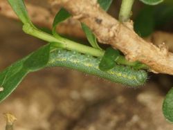 Damit ist nur klar: Wenn hier bei uns ein Weibchen des Artenpaars nicht an Hufeisenklee ablegt, kann es kein Weibchen von Colias alfacarensis sein. Findet man deren Raupen an Hufeisenklee, können sie somit von beiden Arten stammen. Allerdings kann man die Arten nach der zweiten Häutung leicht voneinander unterscheiden - wie auf dem Foto vom 05.10.2023.