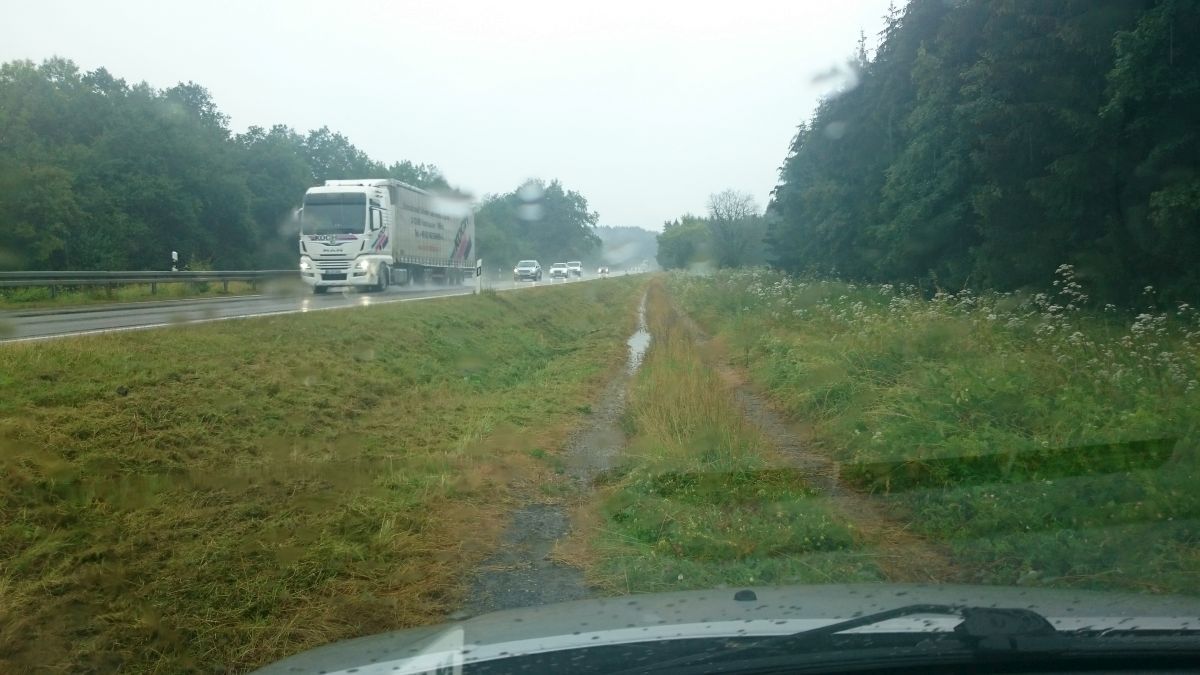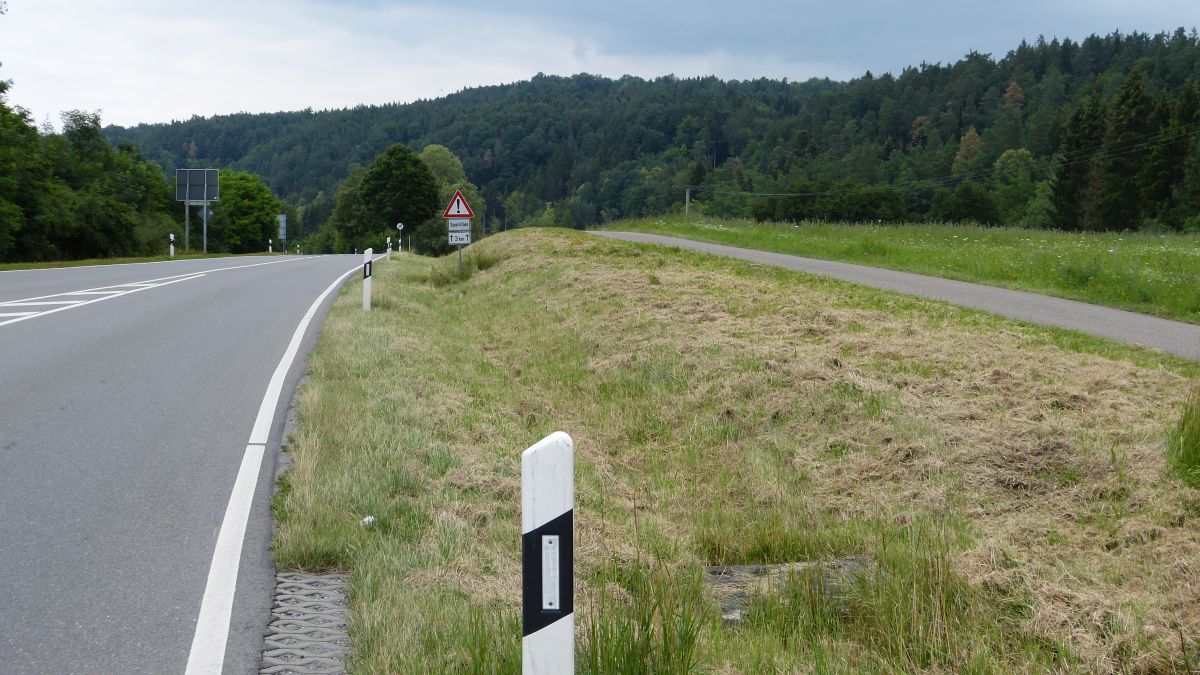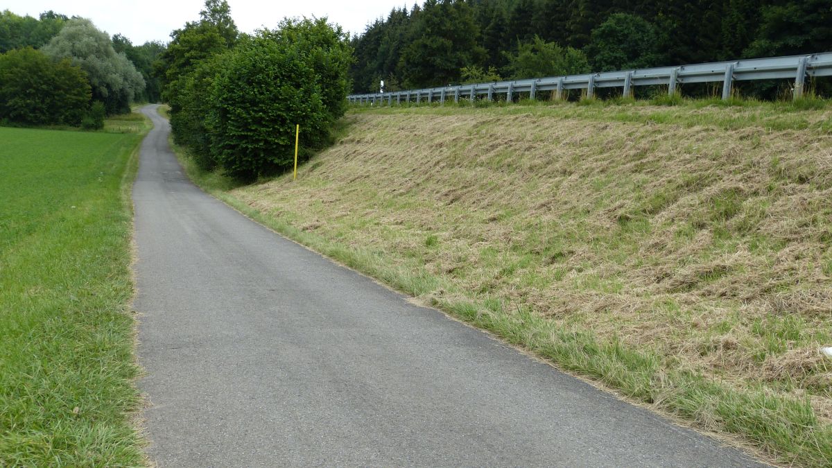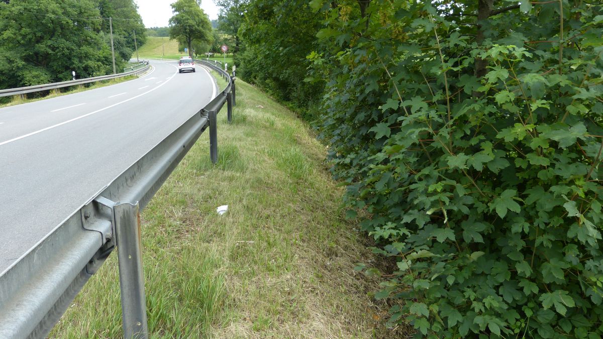 Weil auf dem Arbeitsplan der Straßenmeisterei jetzt das Böschungsmähen steht, fahren die Maschinen aus. Und dieselben dann ihre Mäharme - so weit sie langen können. Und weil es gerade so schön regnet, kann man sich schon denken, wo die ganzen Insekten sitzen - und was sie dann tun, wenn der Mäharm kommt. Natürlich könnte man auch nur den Bereich um die Straßenbegleitpfosten mähen. Aber warum hat man denn so schöne Maschinen, mit der man die ganzen Böschung rauf oder runter kommt?