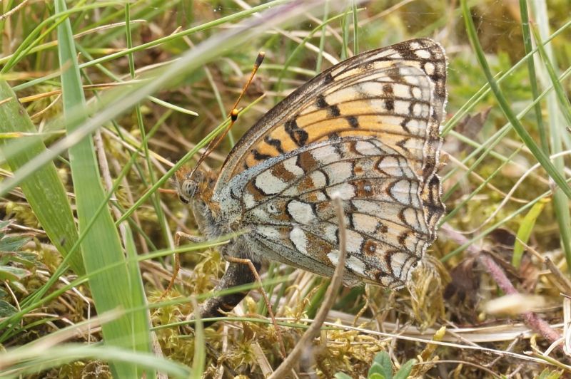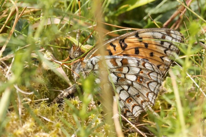 Im Zielgebiet auf 900m Höhe angekommen, begann auch gleich die Suche nach den verschiedensten Faltern. Nach kurzer Suche fiel hier dann gleich ein Tier auf, das sich eigentlich mehr am Boden kriechend anstatt fliegend fortbewegte. Nach eingehender Betrachtung handelte es sich hier eindeutig um ein Fabriciana niobe-Weibchen.