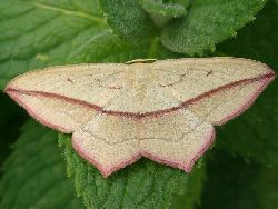 Der Ampferspanner ist an seinem roten Flügelsaum, den eckig vorstehenden Hinterflügeln und der durchgehenden, in den Vorderflügelspitzen endenden braunroten Binde sofort zu erkennen.