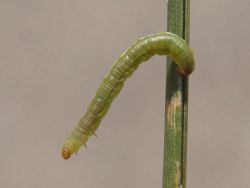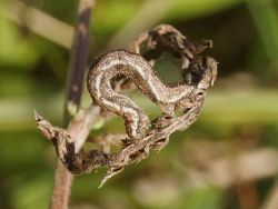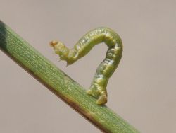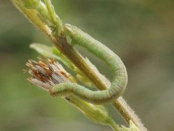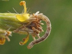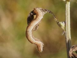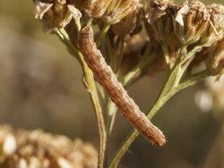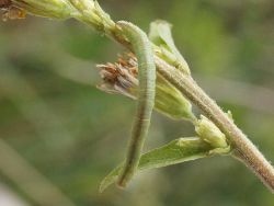Die Raupen sind zwischen Mai und September an Blüten und Samen vieler Pflanzen zu finden, u.a. an Waldrebe (Clematis vitalba) und Mädesüß (Filipendula ulmaria).