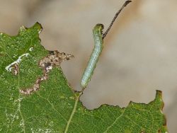 Die Raupe besitzt mit ihren verlängerten Vorderbeinen eine für Schmetterlingsraupen ungewöhnliche Gestalt und hat eine Vielzahl von Laubgehölzen wie Hainbuche, Hasel, Birke, Rotbuche, Eiche, Pflaume, Schlehe, Ahorn sowie Hartriegel als Nahrungspflanze. Sie ist von Ende Juli bis Anfang Oktober zu finden.