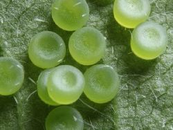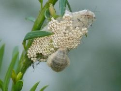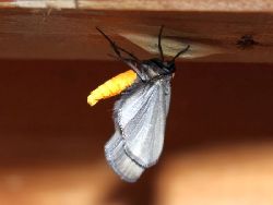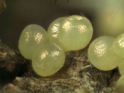 Das Weibchen klebt bald nach der Kopula einen "Haarteppich" auf die Unterlage und legt darauf seine Eier ab, so dass ein schwammartiges Gebilde entsteht - daher der Name.