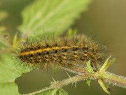 Die erwachsene Raupe des Schlehen-Bürstenspinners zeigt besonders schön die für alle "Bürstenspinner"-Arten typischen bürstenartigen Haarschöpfe auf dem Rücken und die pinselartigen schwarzen Fortsätze.