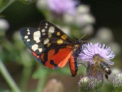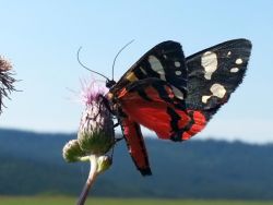 die Falter oft im Hochsommer auf Waldwegen an dessen Blüten saugen. Gerne nehmen sie auch andere violettfarbige Blüten wie etwa Disteln oder Skabiosen, wo sie manchmal gemeinsam mit Widderchen zu beobachten sind (wie auf dem Foto links oben mit einem Bergkronwicken-Widderchen).