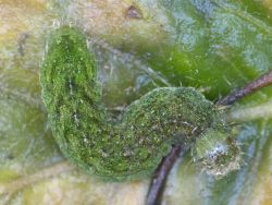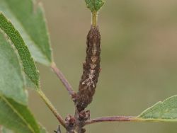 Die Raupe wird selten gefunden. Sie lebt vermutlich nur im Mai an den Schösslingen verschiedener Laubgehölze, neben Ulme (Ulmus spec.) auch an Apfel (Malus domestica) oder Schlehe (Prunus spinosa).