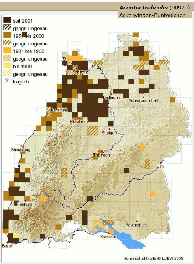 Acontia trabealis ist in den Wärmeinseln des Landes am Oberrhein und im Gebiet zwischen Kalrsruhe, Heidelberg, Heilbronn und Stuttgart wohl auch relativ weit verbreitet. In "unserer Nähe" gibt es nur zwei alte Nachweise von Axel Steiner aus den 1980er Jahren aus dem Raum Rottenburg und Tübingen und auf der Alb wurde 2011 ein Falter bei Hohenstein nachgewiesen. Die beiden Beobachtungen im NSG Kapfhalde und bei Hechingen-Weilheim sind also eine Überraschung.