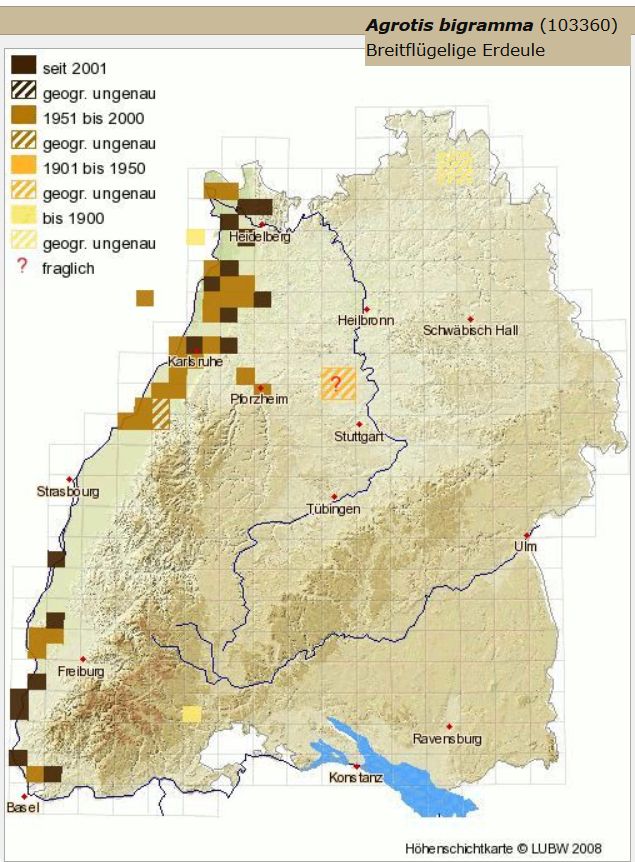 Noch deutlich überraschender ist jedoch der Anflug einer Agrotis bigramma im Hausgarten in Haigerloch-Stetten, denn die nicht besonders häufigen aktuellen Nachweise aus Baden-Württemberg stammen allesamt aus dem Umland des Rheintals zwischen Basel und Mannheim und außerhalb dieses Raums gab es seither noch keinerlei Nachweise. So muss wohl auch dieser Fund als Anzeichen des Klimawandels gewertet werden.