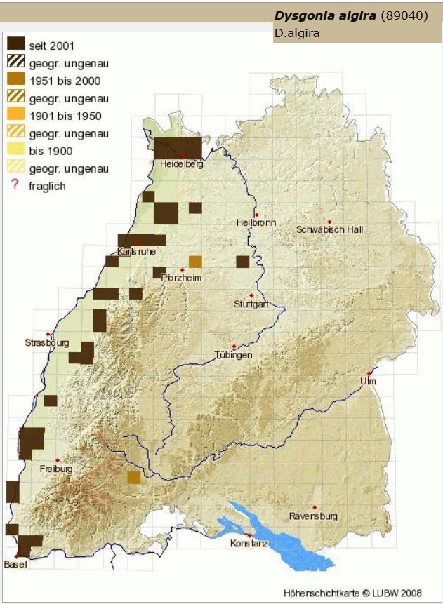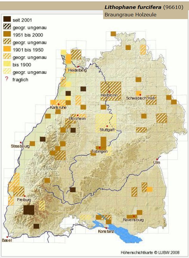 Noch weniger Nachweise gibt es seither von Lithophane furcifera und abgesehen von ein paar Nachweisen aus dem Schwarzwald und dem Kraichgau verzeichnet die Landesdatenbank aus unserem Einzugsgebiet erst zwei Funde von Walter Bantle aus dem MTB 7917/2 Villingen-Schwenningen Ost. Auch dieser Anflug ist damit recht überraschend.