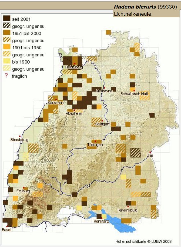 Das Haupt-Verbreitungsgebiet von Hadena bicruris in unserem Bundesland sind die Hackfrucht- und Unkrautgebiete des Kraichgaus. Abgesehen von ein paar Nachweisen der letzten Jahre am oberen Neckar gab es seither auch im weiteren Umkreis keine Nachweise aus unserer Gegend.