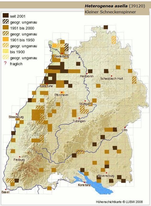 Wenn man von ein paar Nachweisen in den 1980er Jahren im Raum Herrenberg und Gärtringen absieht, gelten auch für Heterogenea asella dieselben Aussagen wie bei den vorgenannten Arten. Dass nun der erste Falter aus dem Landkreis ausgerechnet auf beinahe 900 m in Bitz auftaucht, ist jedoch erst recht eine handfeste Überrauschung.