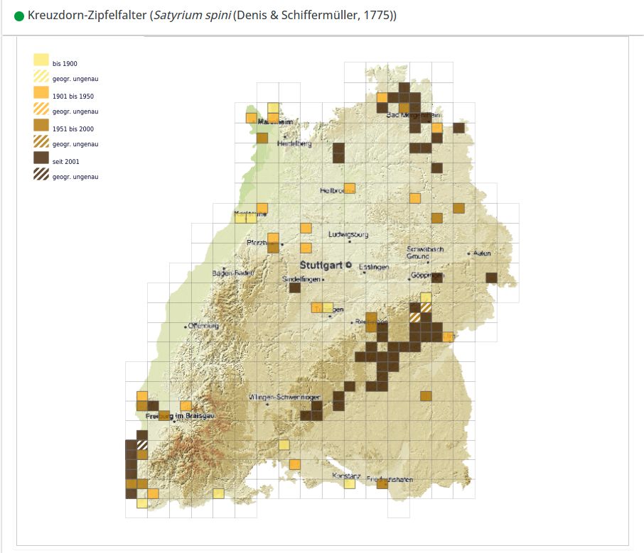 In der wissenschaftlichen Sammlung von Friedemann Treuz steckte seither ein Falter aus Bitz aus dem Jahr 1985, während die Landesdatenbank 3 Nachweise aus den Jahren 1991 bis 2015 enthält. Im letzten August gelang dann erstmals ein Lebenfoto - erneut in Bitz.